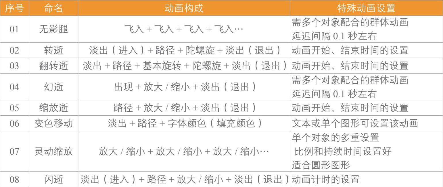 让我们一起来完成 3.4.3 节表格中所有动画组合的操作,操作示例样本参见配套下载资料包中的“3.4.2 微动画组合操作示例”PPT文件。