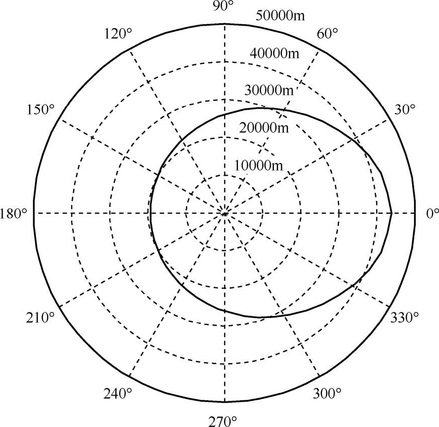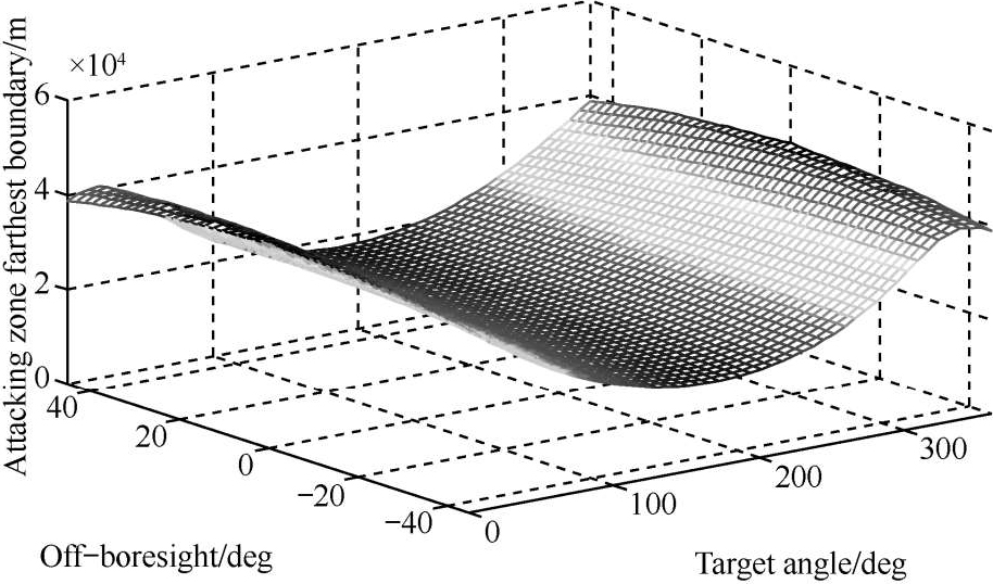 然而实际空战中,导弹发射存在离轴角(视线与速度矢量夹角),考虑水平离轴角对攻击区远边界的影响,假定离轴角最大范围±45°,给出360°全向攻击区远边界与水平离轴角的关系,如图3所示。