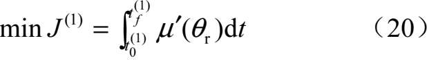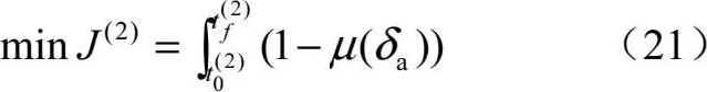 (1)规划的第一段即规避目标威胁的任务需求来说,相对方位角调整得越快,目标对UCAV威胁性越小,即要求在尽可能短的时间达到满足UCAV规避约束条件的末端点,因此,将瞬时暴露威胁值,即使式(6)在整段规划时间域内进行积分,并取最小值,这就保证了UCAV可以最快地规避到目标的雷达最大探测角度之外。选取Lagrange型代价函数为