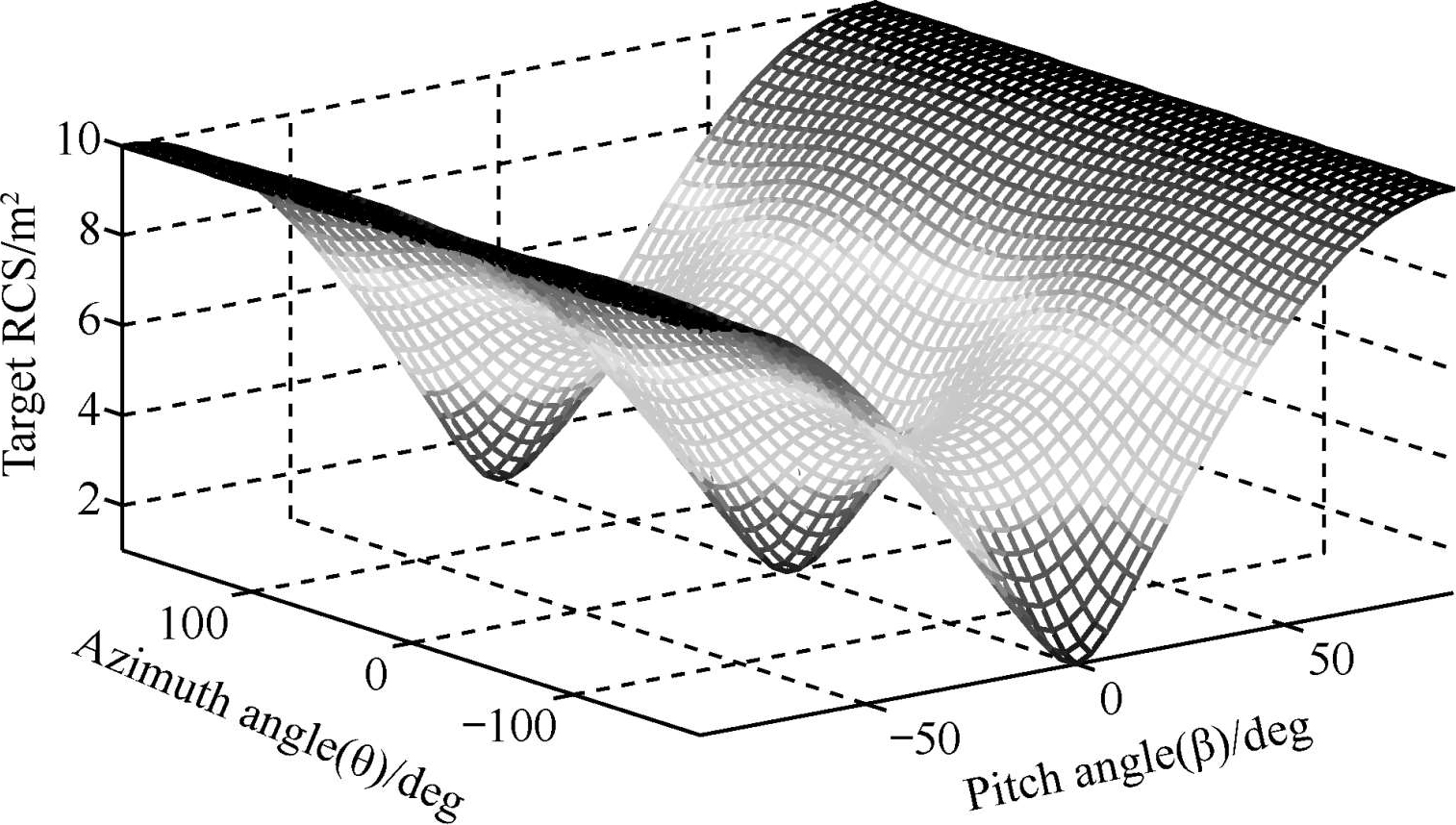 式中, θ r , β r 分别为雷达观测的方位角和仰角;a rcsx 、b rcsy 、c rcsz 分别为机体轴向、两翼和腹背方向RCS值。在此,假设三者分别为1m 2 、5m 2 、10m 2 ,UCAV全向RCS如图4所示。