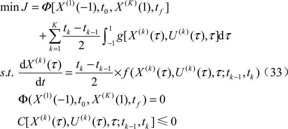 采用hp自适应伪谱法求解最优控制问题,需要对时间区间进行变换,把 t ∈[ t 0 , t f ]划分为 K 个网格区间[ t k-1 , t k ](其中 k =1,2,…, K ),总共包括 K +1个分割点 t 0 < t 1 <…< t K = t f 。对划分的时间网格区间做如下变换: