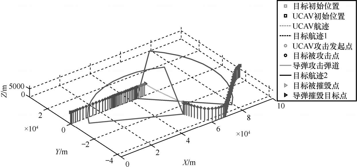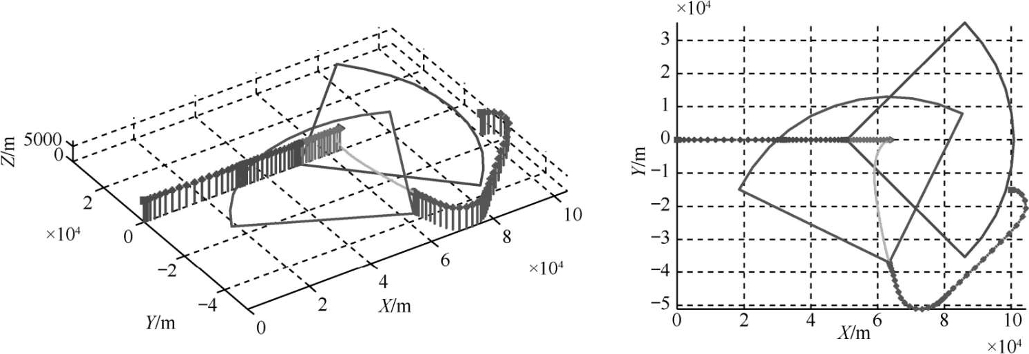 UCAV初始位置(100000m,-15000m,7000m);初始速度250m/s,航迹倾角0°,航迹偏角180°;目标初始位置(0m,0m,7000m);初始速度250m/s,航迹倾角0°,航迹偏角0°;假定机载雷达对RCS为5m 2 的目标最大探测距离为50000m;假定目标在没有探测到UCAV前机动状态保持不变,目标在UCAV探测范围外时,UCAV需要的目标位置信息由地面雷达传送。UCAV模型参数参考F-4“鬼怪”战机 [12] ,导弹与雷达模型如前文所述,目标与UCAV参数相同。仿真结果如图6和图7所示。