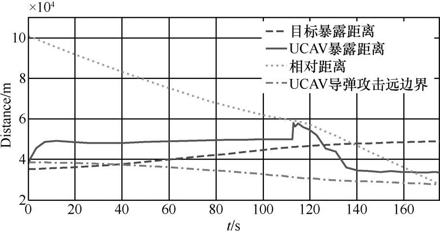 图10给出了四种距离随时间变化的关系。其中暴露距离是指在当前RCS值下被雷达可探测的最远距离,见公式(4)。在 t =113s时刻前,UCAV的暴露距离小于UCAV与目标的相对距离,避免了被目标雷达发现。在 t =113s后,由于UCAV的RCS短暂波动,UCAV暴露距离相应增大,但都小于相对距离,且此时UCAV已经位于目标探测包络外。在 t =166s时刻,目标暴露距离开始小于相对距离,此时UCAV可以对目标进行主动扫描和跟踪。在最后 t =175s时刻,目标进入UCAV导弹攻击包络范围,UCAV发射导弹,目标被击毁。
