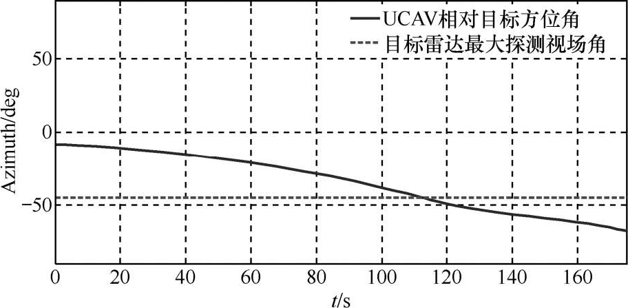 图8给出整个规划时间域上UCAV相对目标方位角的变化。在 t =113s时刻,UCAV相对目标的方位角超过了目标雷达最大探测包络角度,满足第一阶段航迹规划的末端约束。且方位角随时间增大,UCAV与目标视线越来越靠近两翼方向,获得的目标RCS值越来越大,规避了目标威胁的同时获得了对目标更远的探测距离。