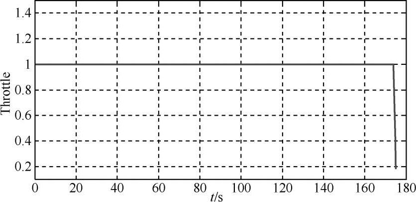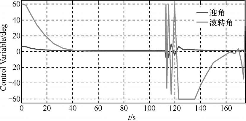 图11~图12给出了UCAV三个控制量的变化曲线。曲线连续,满足控制量的约束条件,证明了航迹规划结果的正确性与可行性。