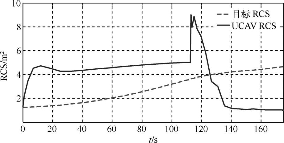 图9给出了整个规划时间域内的UCAV与目标的RCS变化。在航迹规划的第一阶段内,初始时刻UCAV与目标相向运动,二者RCS相同。下一时刻,UCAV左转,以增大对其相对目标的方位角。UCAV在进行左转机动时,由于法向加速度指向的逆时针偏转,相应产生的滚转角将使UCAV的RCS迅速增大。随后,UCAV保持平飞状态,由于UCAV偏航角不为0°,目标相对UCAV的方位角大于UCAV相对于目标的方位角,因此反映在图中为UCAV的RCS大于目标。在第二阶段内,UCAV由规避转为攻击。UCAV右转迎向目标,转弯产生的滚转角增大了UCAV的RCS,随后迎头接近目标,RCS迅速降低并且保持稳定。整个阶段保持了较小RCS的优势,满足低可见性接敌的作战需求。