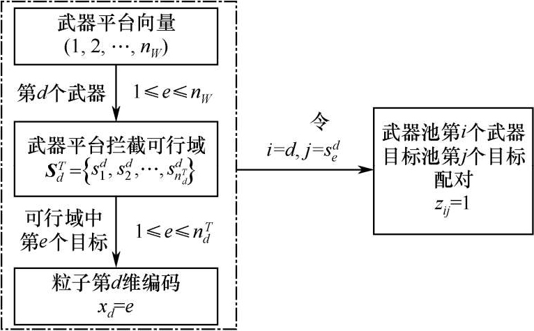 用粒子群算法求解火力分配问题时,首先将分配问题进行合理的编码。常规的做法是将粒子对应为长度和火力单元数相同的变量,粒子的每维 x i 表示火力单元拦截的目标编号。这种编码方法概念清晰、编码简单,但求解过程假设每个火力单元都可对任意目标进行拦截,即没有考虑式(3)的作战约束。