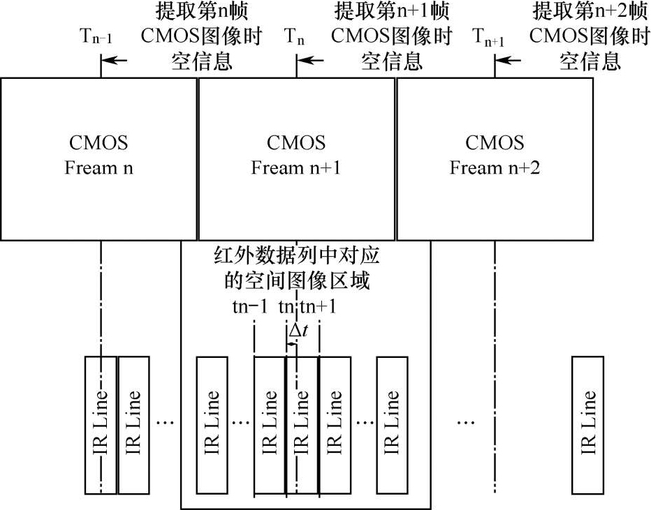 多源异类传感器数据融合处理的前提条件是每个传感器获得的信息必须是同一空间的同一时刻的描述。这包括每个传感器得到的信息是同一坐标系下的描述,即空间配准,其次要保证各个传感器之间的数据应该在时间上对齐,即时间配准。在本文适用的搜索设备中,各传感器的相对位置固定由机械装调保障。但是由于各传感器的采样周期、工作方式的不一致以及探测信息返回的延迟等因素影响,各传感器对场景中同一目标观测所得的数据有可能存在时间上的差异,这些将导致多传感器对目标描述的差异。而受到转台转动均匀性的影响,拼接后的周视图像存在周与周之间图像差异,导致不同周图像信息难以对目标进行关联检测,后续多传感器信息配准难以进行。