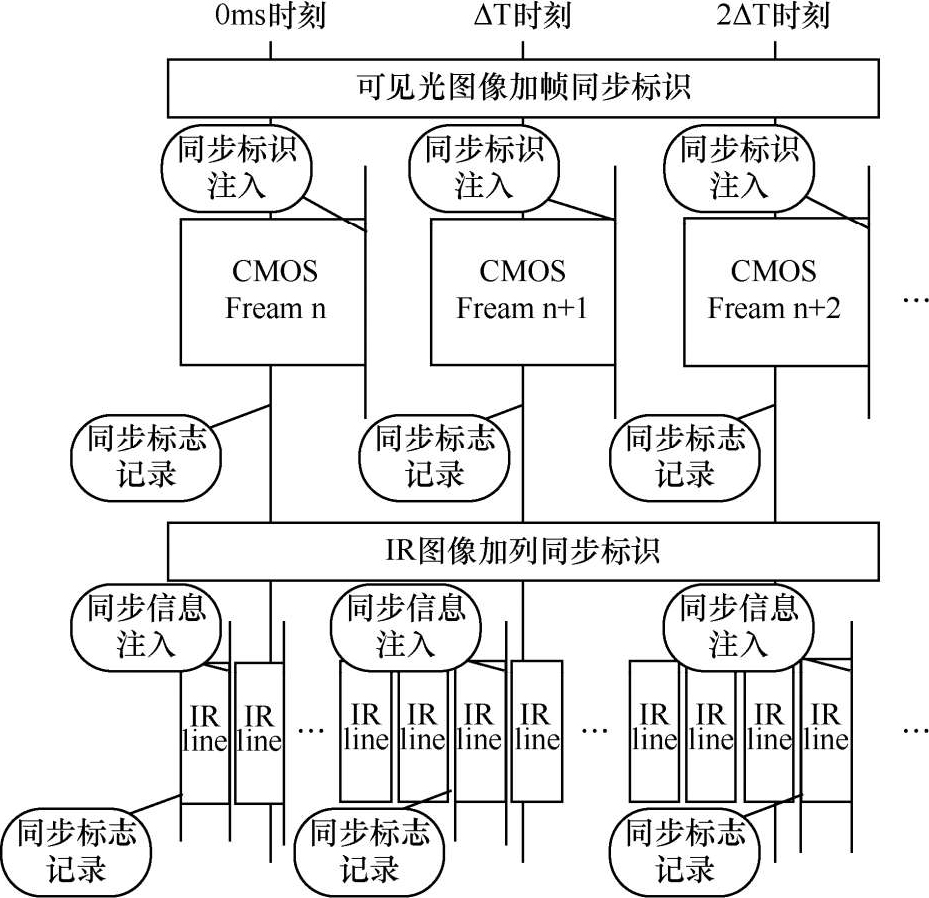 本项目中,多传感系统因可见光相机分辨率高、视场角度大,所以输出图像较为直观。采用这一可见光图像作为基准图像,在红外图像列中寻找与可见光图像视场一致的图像数据,雷达数据返回信息中自带有探测目标的时间、位置与速度信息等,通过计算叠加在图像上对目标进行位置指示。可见光图像由控制系统产生的外触发信号触发工作,外触发信号由控制系统周期性产生,在触发相机曝光时记录同步标识信息,等待采集到可见光图像帧时将同步标识注入至图像首行数据中。红外图像数据以列的形式输出,列积分时间较短,采用每列数据叠加同步标识信息的方式,叠加信息的时间误差约为一列红外数据输出时间,在图像上表示即1个像素误差,本文中多源数据叠加时空同步标志如图4所示。