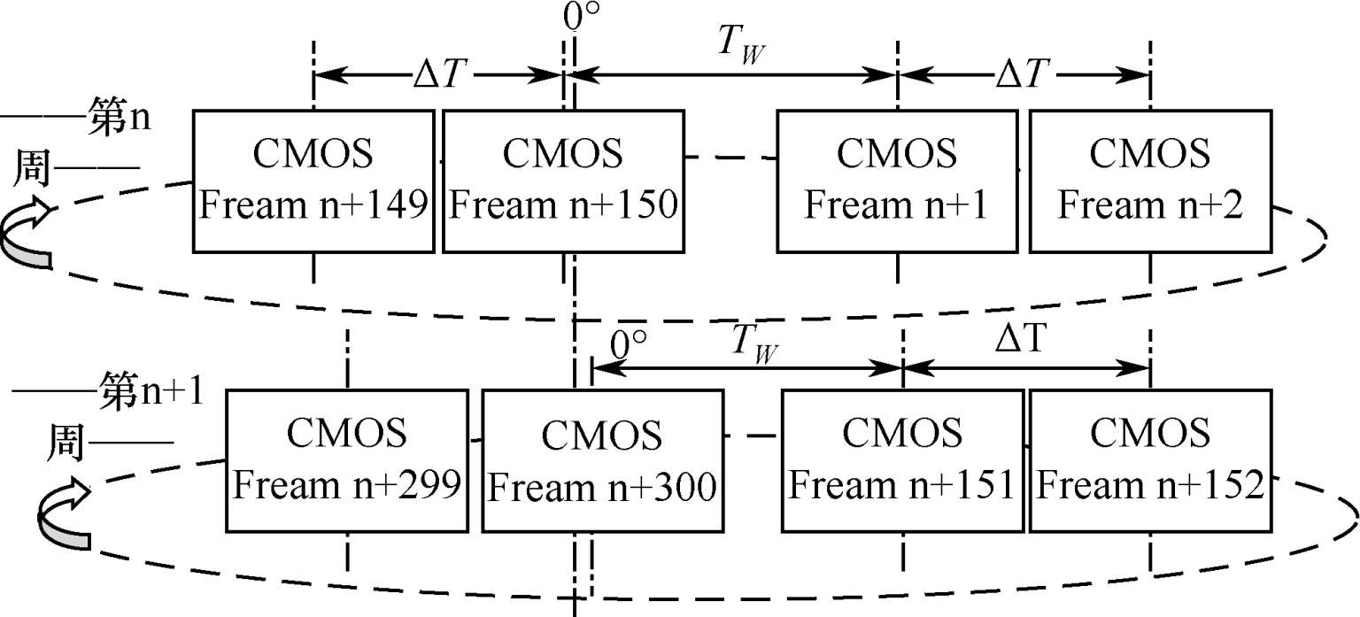 由于转台旋转速度的不均匀性等因素影响,每周图像帧之间存在误差,若不做处理,则每周在同一位置附近获取的可见光图像也将存在差异,随着多周的累积效果,同一目标在可见光图像中位置表现会逐渐漂移,不利于多周间对目标信息进行关联检测。本文系统设计了过零触发的方式对探测器工作时刻进行了同步处理,利用转台过绝对零位时产生的脉冲对探测器工作状态进行一次校正。即每次探测器工作时间原点以过零位时接收到的脉冲为起始时刻,每一周对可见光相机进行固定次数的外触发曝光。为了防止上一周未传输完的图像对当前周采集数据的影响,多传感器将在过零位后等待固定时间 T W 后进行工作,在等待时间内足够完成一帧图像数据的传输,如图6所示。由于此时间段内传感器均未工作,因此,这种方式使得系统存在着一个小角度的盲区。多周同步综合误差由角度传感器精度误差、FPGA角度采样延时误差、探测器曝光采样延时误差、转台匀速性误差等造成。经过分析计算,典型工作模式(180°/s)时,过零位后首帧图像最大综合误差约为Δ α =80s,此误差根据转台速度增加而增大,基本呈线性关系。采用多周数据同步处理后,传感器在每周将不会累积误差。
