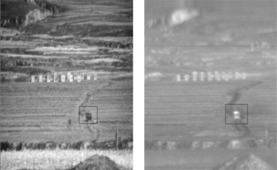 采用本文设计的多源异类传感器采集控制系统,在平台高速搜索时远距离车辆目标的探测结果局部如图7所示,左边是经过配准后输出的可见光图像,右边是利用时空同步标识搜寻的红外图像列组成图像。可见光相机与红外热像仪能够精准地对同一场景进行匹配图像输出,结合雷达输出数据探测到移动目标的相对距离信息与位置信息绘制出目标运动轨迹图,能够从多个传感器的角度对目标进行描述。三传感器在单独工作时在对目标检测识别上均会存在错检漏检目标信息,结合三探测器综合信息将能够进一步提高对目标判定的精准性。