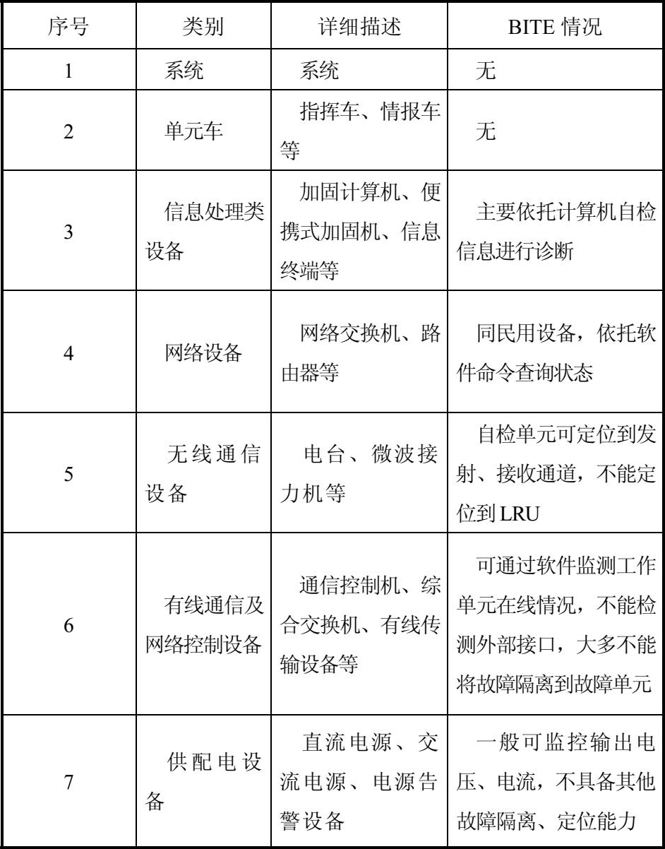 按照国军标规定的测试性设计要求,信息系统装备在研制阶段都提出了测试性指标并进行了相应设计,但是其自检、自测试功能多面向单体设备构建,功能设计较为简单,基本情况如表1所示。