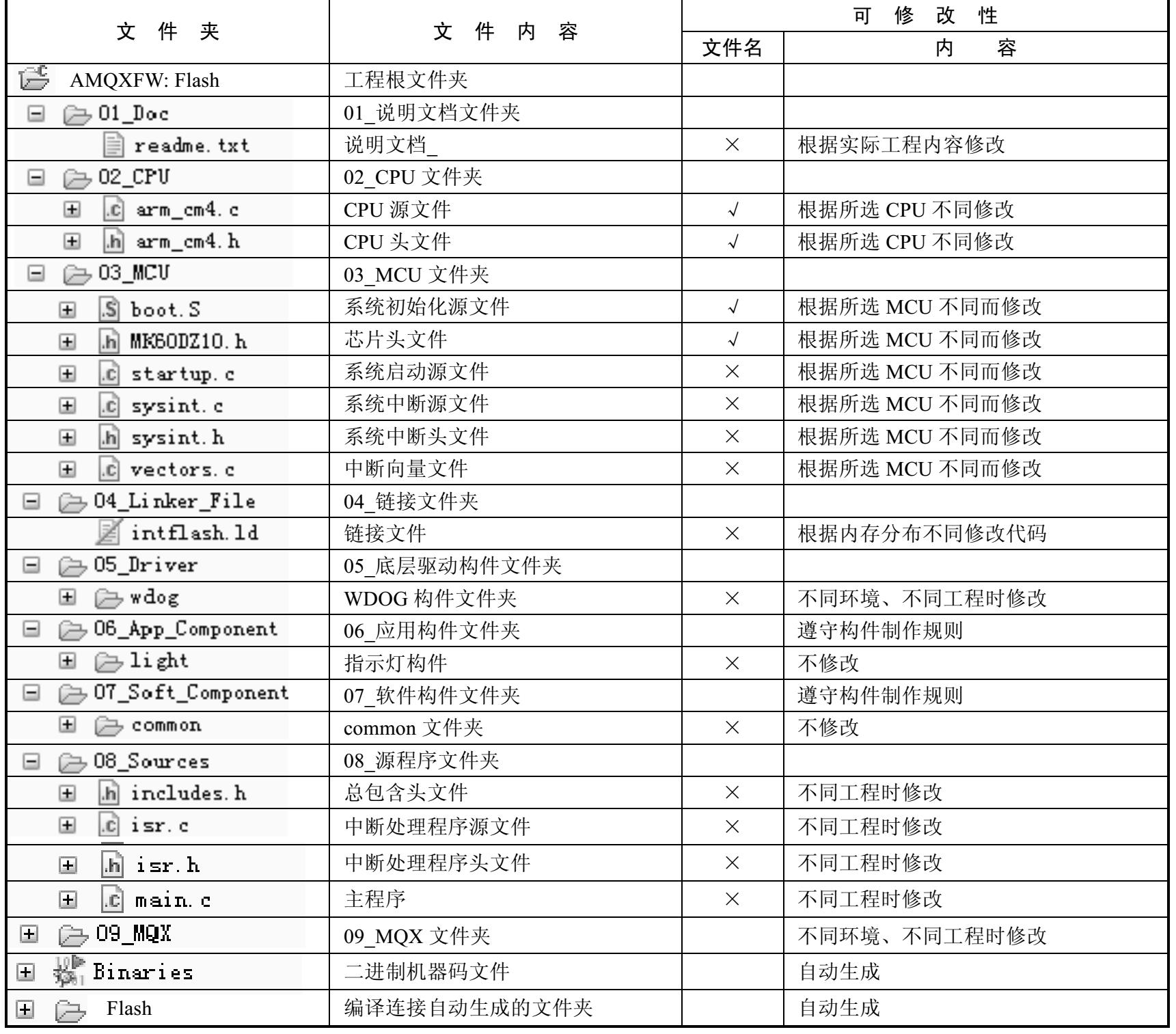 深入理解工程框架的目录结构,对学习、理解与与应用MQX开发实际工程有重要意义。MQX工程框架AMQXFW的基本内容如下。