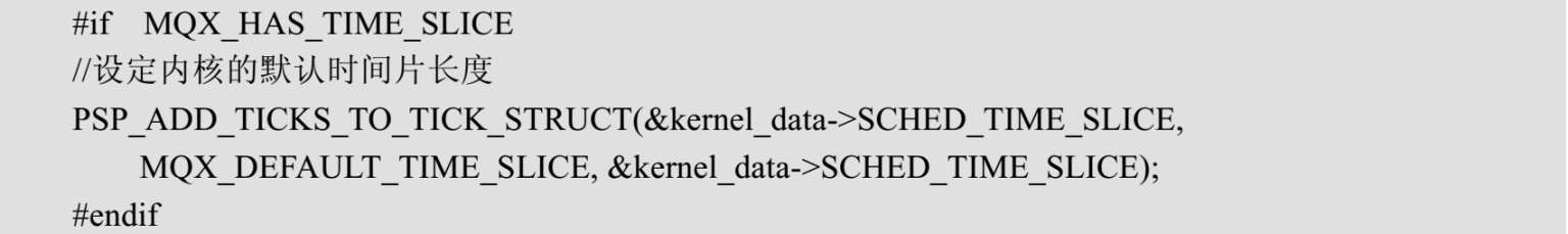 (1)设定默认使用的时间片。若配置使用任务的时间片轮转调度机制(参考5.5节任务的调度策略),则需要为该任务指定任务轮转的时间片长度。若未在任务模板中明确指定任务的轮转时间片长度,则使用系统默认的设定的时间片长度,在MQX启动的过程中对系统默认使用的时间片长度进行设定。