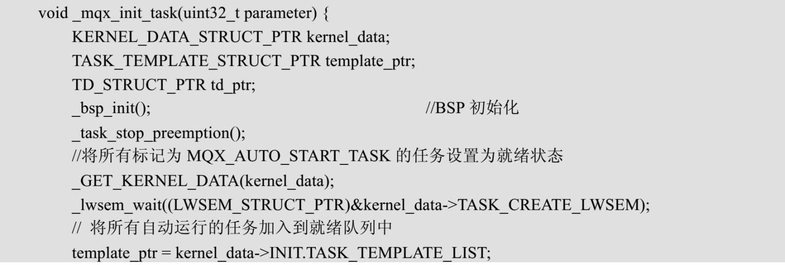 通过调用“..\MQX\kernal\inittask.c”文件中_mqx_init_task函数完成,在_bsp_init()中完成DMA设备列表初始化、内核I/O子系统初始化、默认UART调试串口初始化、内核串行I/O端口初始化。