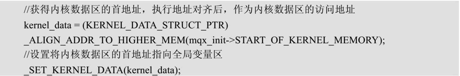(1)创建内核数据区访问指针kernel_data。内核数据区空间是在链接命令文件中定义的,属于BSP的内容,为了提高相对于BSP的独立性,此处创建了一个内核数据区访问指针,并定义了访问接口。