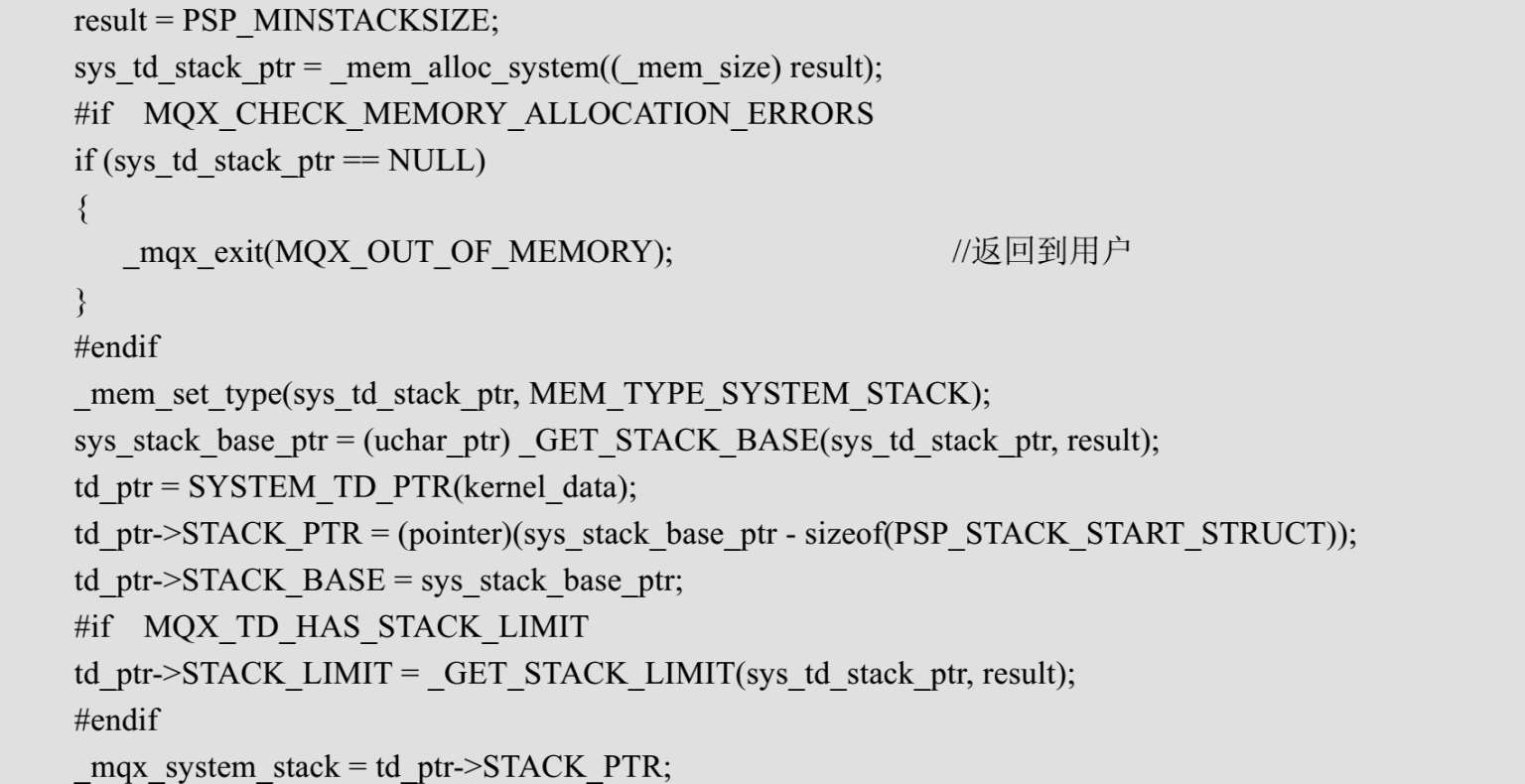 (4)创建系统空闲任务栈。系统空闲任务是MQX系统自动维护的,非用户创建。当系统空闲任务被中断阻塞时,使用系统栈保存空闲任务的上下文。空闲任务栈的大小为PSP_STACK_START_STRUCT结构体的大小加上PSP_STACK_ INTERRUPT_OVERHEAD(116字节)再加上PSP_STACK_KLOG_OVERHEAD(因为没有启动内核日志,该字段大小为0字节)。