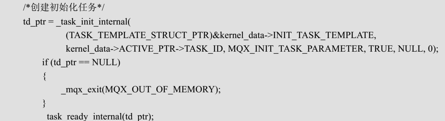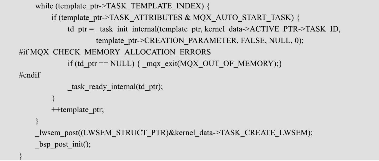 (4)启动调度系统。在做好所有启动MQX的准备后,启动调度程序,开始执行多任务的调度,至此,系统开始工作。