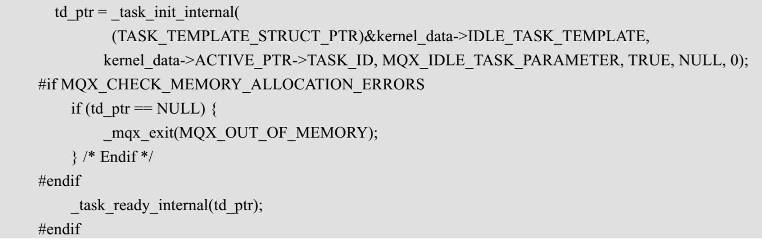 (3)创建并启动空闲任务。为便于维护系统中的任务队列,一般情况下,MQX会创建一个空闲任务。当所有应用任务均不再执行,系统仍然运行一个空闲任务,以保证MQX的调度系统保持工作状态。空闲任务在MQX初始化过程中创建。