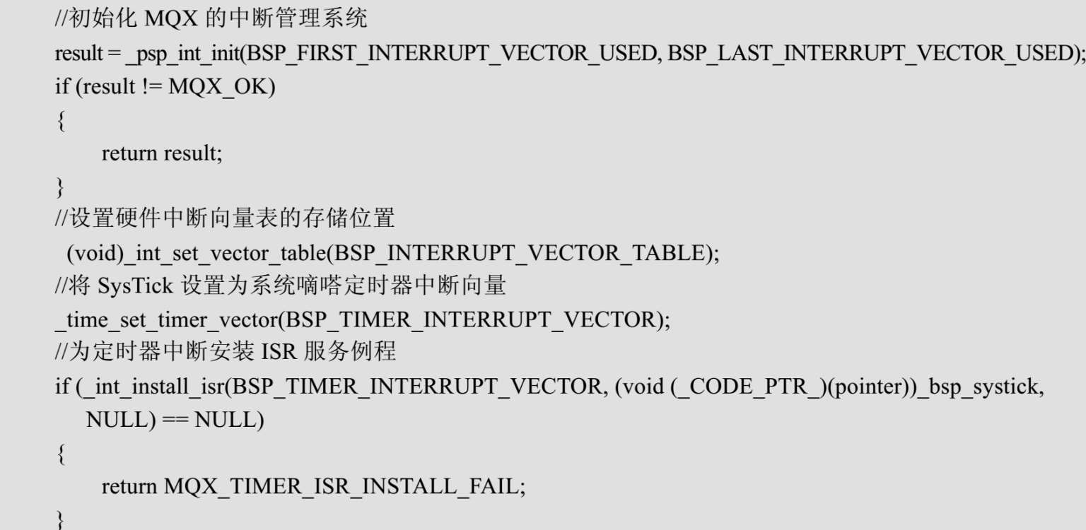 (1)初始化MQX的中断系统。为中断系统分配稀疏中断向量(参见3.3.2节稀疏中断向量表的建立)链接表头节点,初始化稀疏中断向量表。