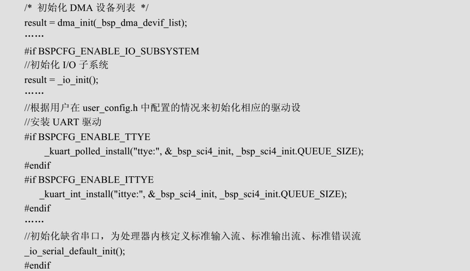 设备驱动程序初始化后安装完毕,才能被纳入到MQX的设备管理器的管理体系之下,从而与文件操作建立起关联。在_bsp_init()中完成DMA设备列表初始化、内核I/O子系统初始化、默认UART调试串口初始化、内核串行I/O端口初始化。