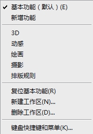 执行“窗口→工作区”命令,可以选择下拉菜单中的命令,如图1-67所示。也可以通过单击选项栏上的“基本功能”按钮,选择需要的工作区,如图1-68所示。