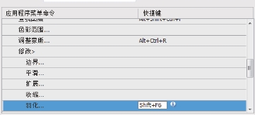 在“快捷键用于”下拉列表中选择“应用程序菜单”,在“应用程序菜单命令”列表中执行“选择→修改→羽化”命令,如图1-70所示。