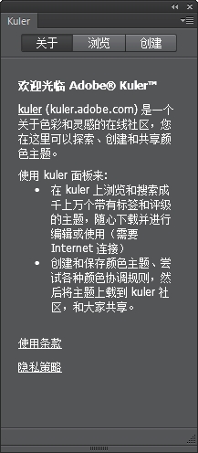 单击“浏览”按钮,可以浏览“Kuler”上的数千个主题,然后下载其中一些主题进行编辑或应用到自己的项目中,如图1-75所示。单击“创建”按钮,用户可以使用“Kuler”面板来创建和存储主题,然后通过上载与 Kuler社区共享这些主题,如图1-76所示。