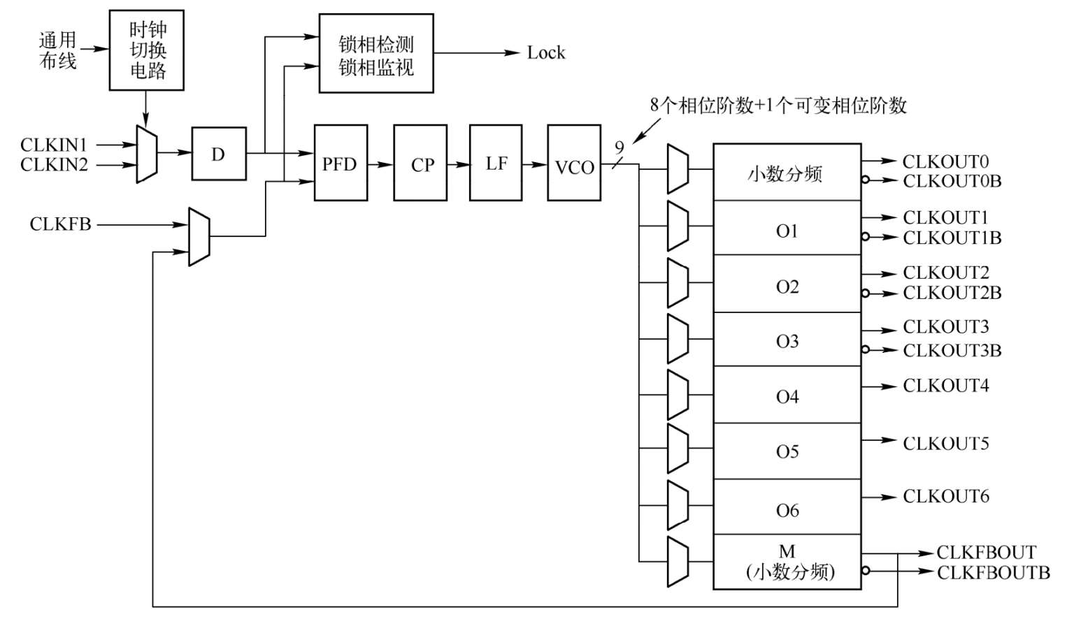 PLL比MMCM的特性要少得多,在一个时钟管理单元内的两个PLL,其基本上是为专用的存储器接口电路提供必要的时钟。在PLL中心的电路类似于MMCM,带有PFD和VCO,以及可编程的M、D和O计数器。每个PLL有两个至FPGA结构的分频输出,以及到存储器接口电路的一个时钟加上一个使能信号。