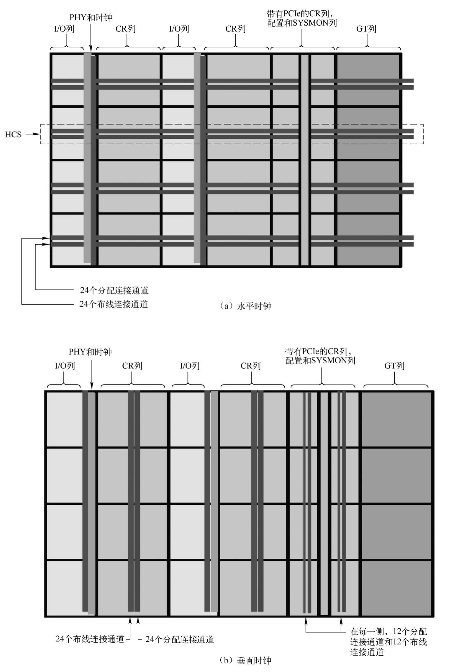 (4)一个水平时钟脊梁(Horizontal Clock Spine,HCS)穿过每行CR、I/O和GT的中间。HCS含有水平布线和分布引线,以及叶子时钟缓冲区,还有在水平/垂直布线和分配之间的时钟网络互连。
