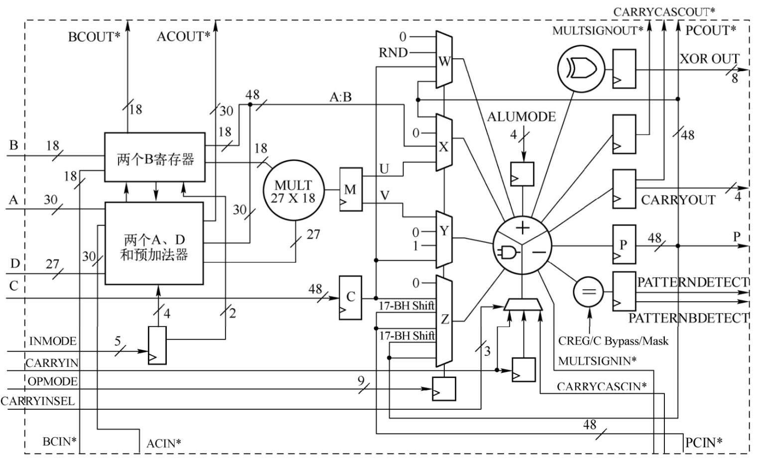 在应用时,可以动态旁路一个乘法器,两个48位的输入能送到一个单指令多数据(Single Instruction Multiple Data,SIMD)算术单元(两个24位加法/减法/累加或者四个12位加法/减法/累加);或者一个逻辑单元,该单元可以实现两个操作数的10种不同逻辑功能其中的任何一种。