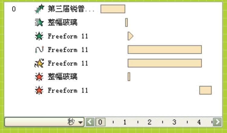 2)为表现连贯效果,看起来同一个动画往往是由不同对象接力实现的。例如:碎玻璃出现并飞散的动画,刚开始是一张图片“整幅玻璃”的快速闪现,随后的飞散效果是由几十张碎片图形(freeform)同时做出的。