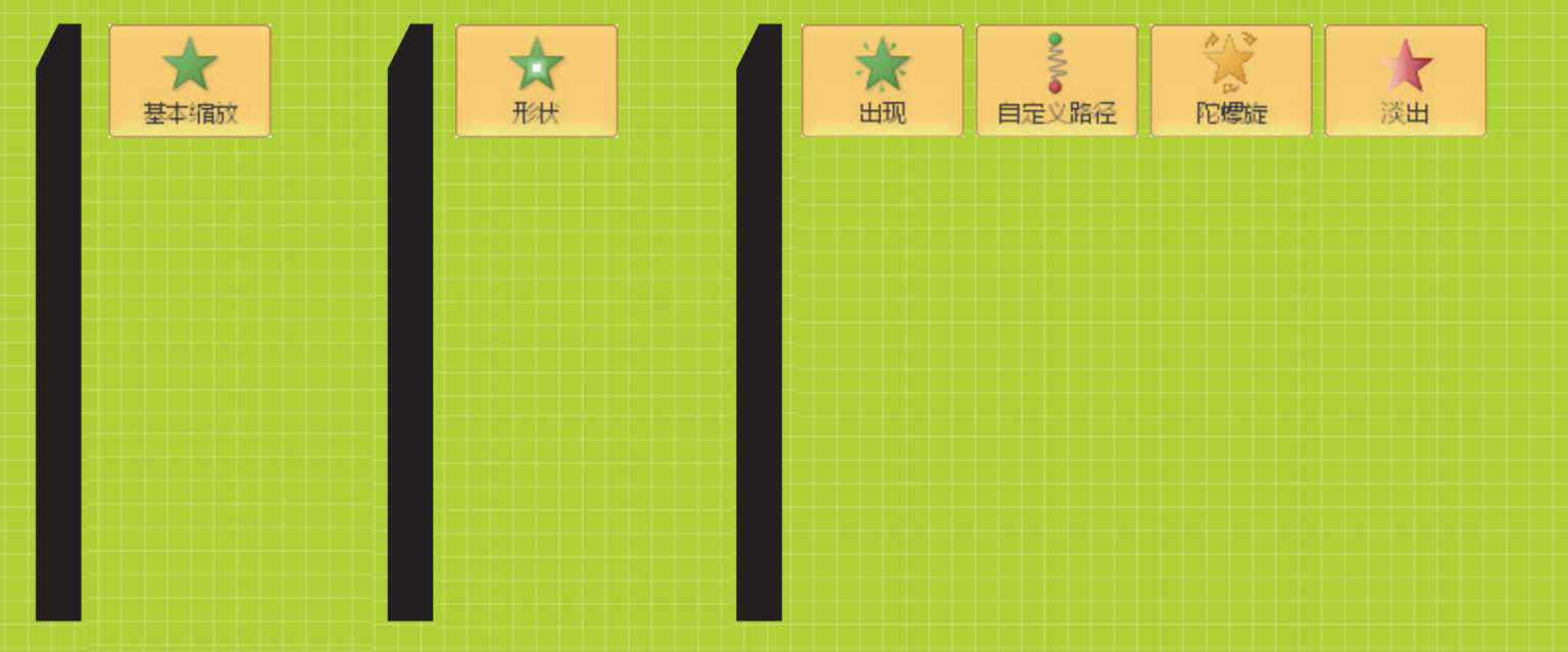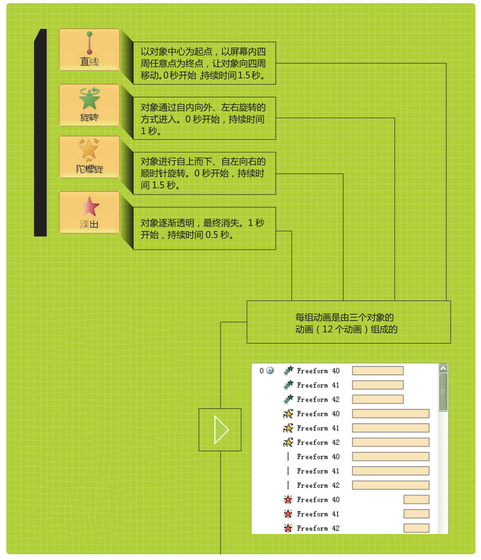要制作从屏幕中心飞出的动画,最简单的做法是直接用直线路径动画:为对象绘制从中心向四周移动的直线路径。但这样的效果显得简陋而僵化,且缺少随意之美。所以,在本例中,设计师采用的是组合动画:直线路径+旋转进入+陀螺旋强调+淡出退出。