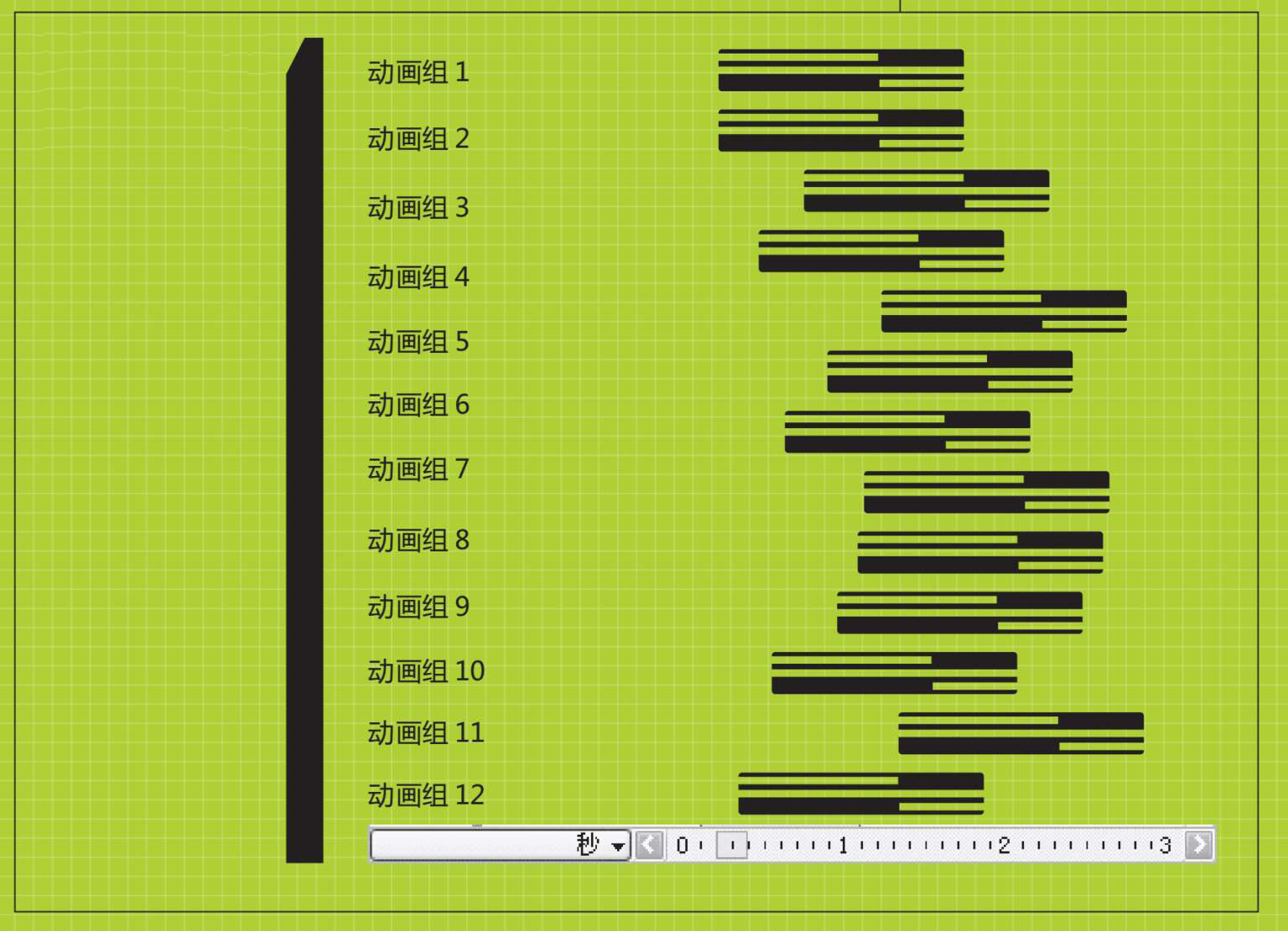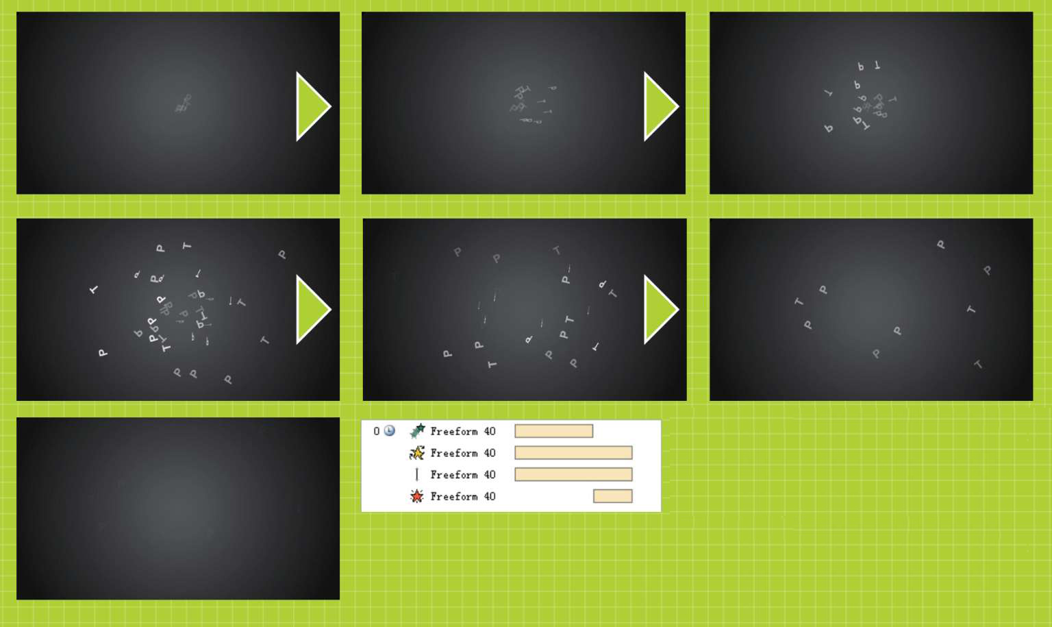 3)多个对象的同时动画和重复动画,营造出一种群体动画的场面,较有气势。“P”、“P”、“T”三个字母为一组,同时向三个方向进行同样的动画;以组为单位的重复不是简单重复,而是错位重复(每组之间有0.1秒的延迟)。这是一种随机和凌乱的美,更加自然。