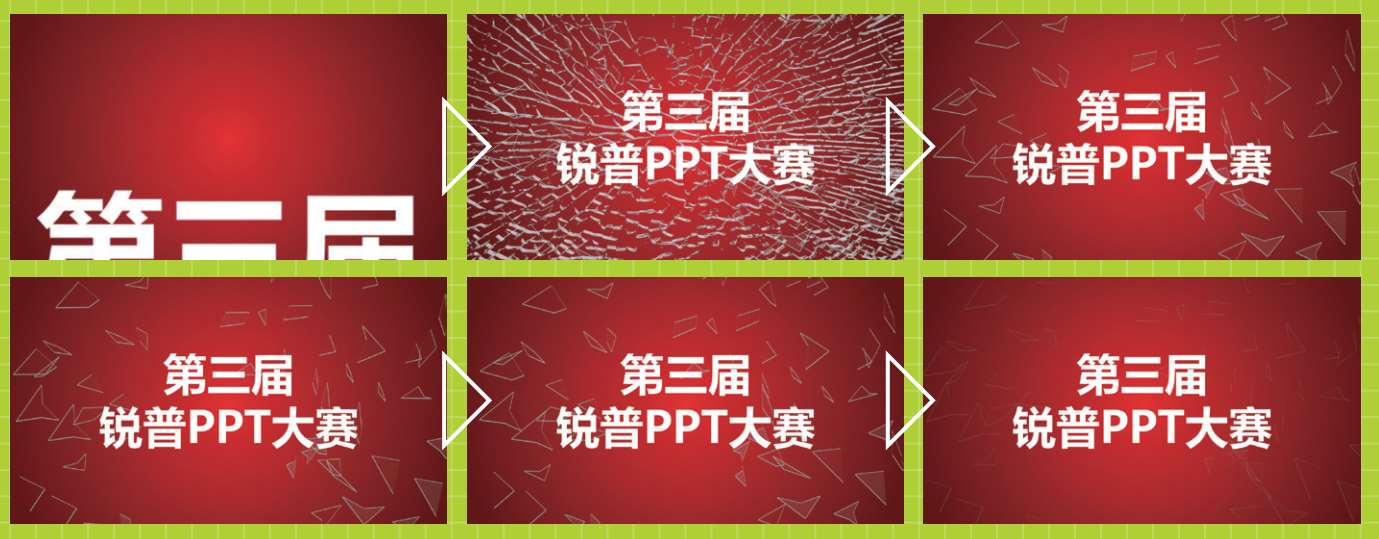 1)不同对象之间动作的衔接是要点也是难点。“第三届锐普PPT大赛”文本是在基本缩放动作结束时才能真正到达画面中心,“整幅玻璃”也应该在这个时候才能出现。