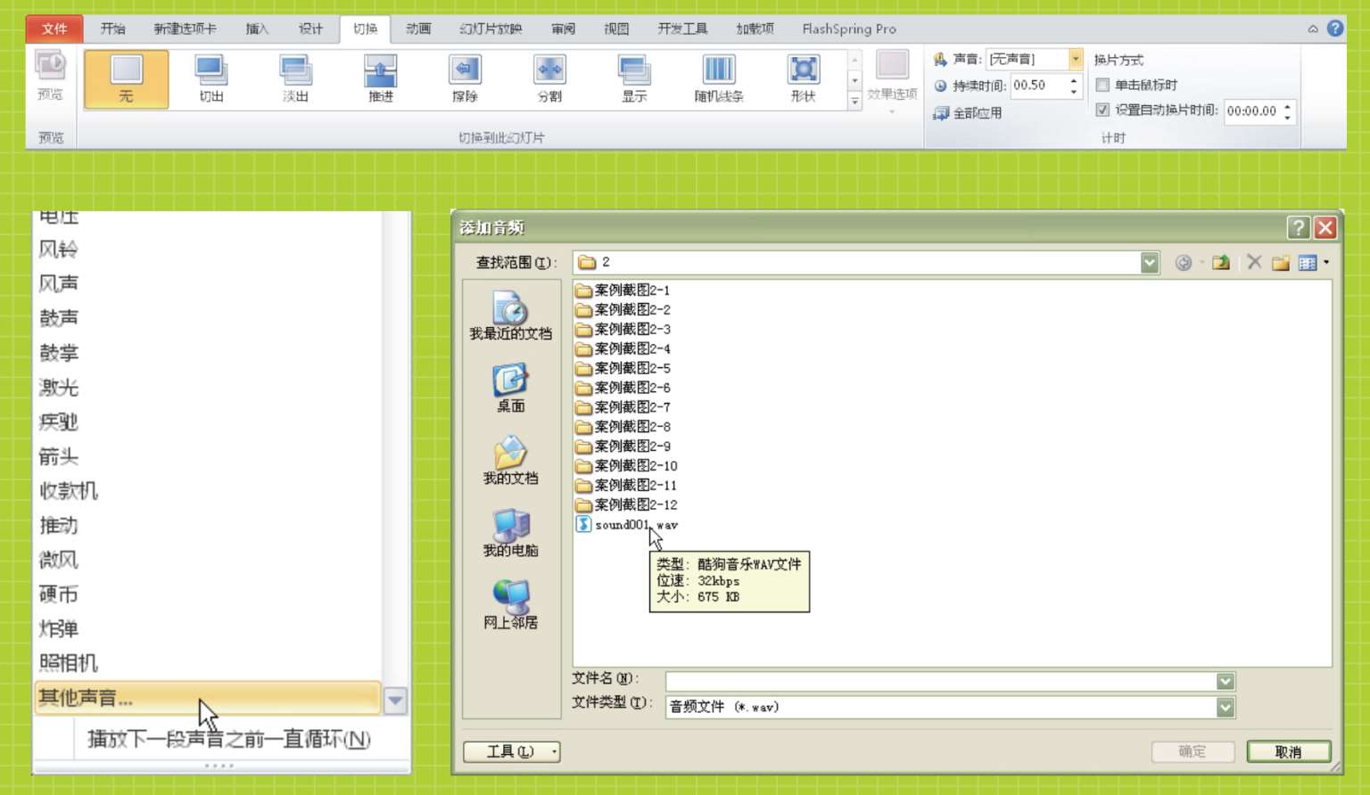 从切换动画插入音频将使声音更加隐秘,不容易被修改和获取源文件,但不足是难以对声音文件进行精细调整。从切换动画插入的声音文件必须是wav格式。