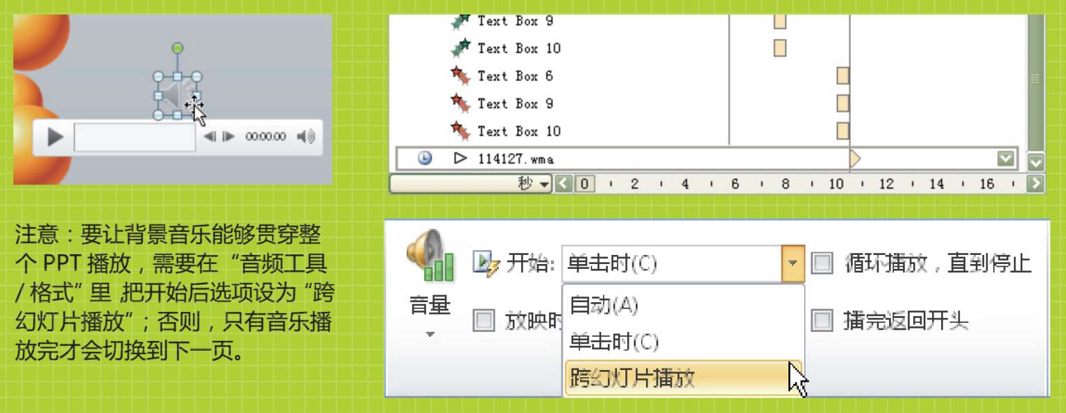 注意:要让背景音乐能够贯穿整个PPT播放,需要在“音频工具/格式”里,把开始后选项设为“跨幻灯片播放”;否则,只有音乐播放完才会切换到下一页。