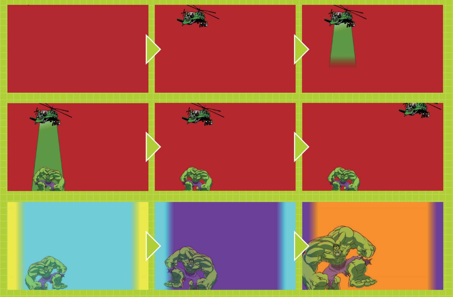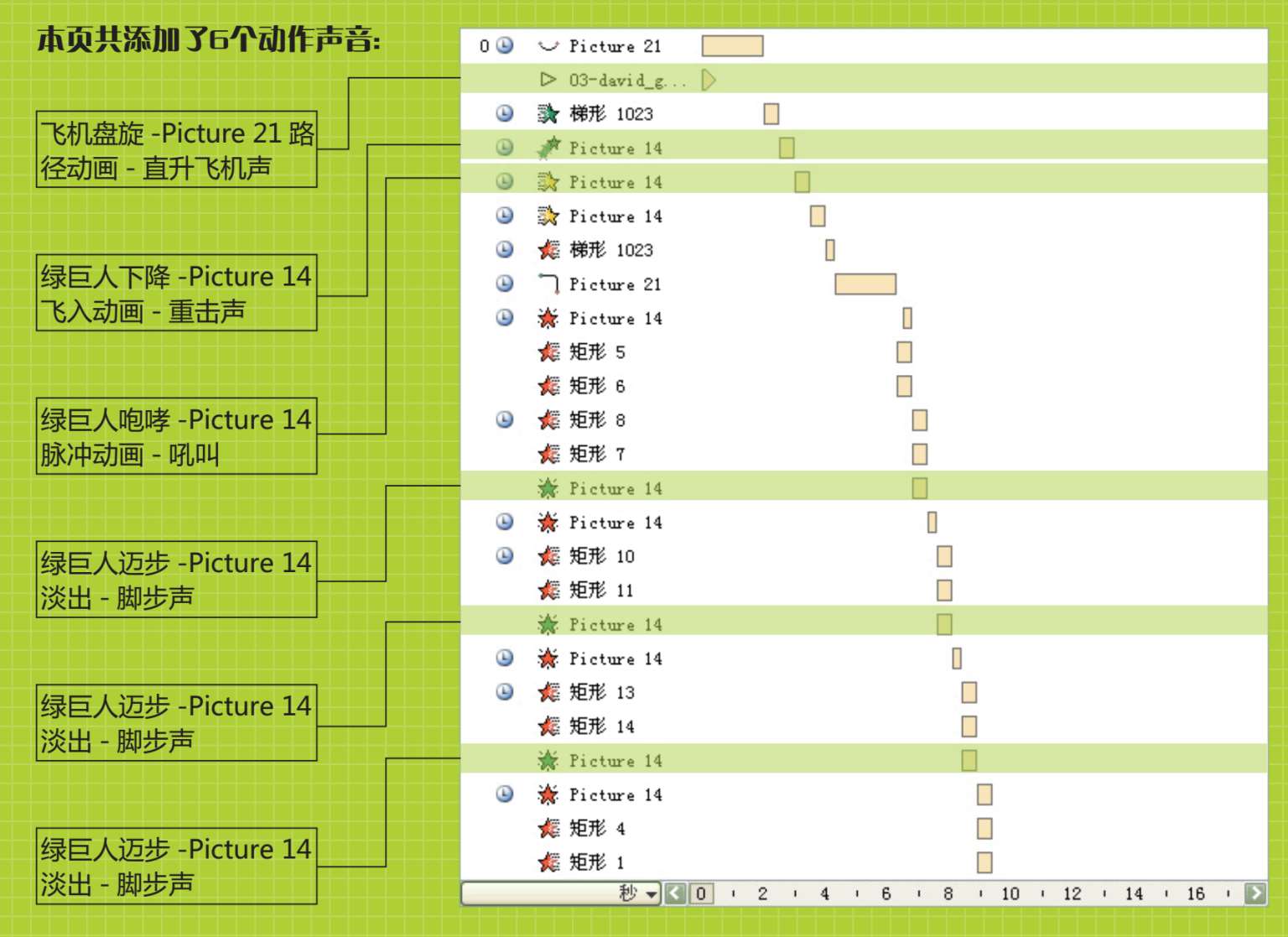 案例2-13是第三届锐普PPT大赛26号作品的片段,表现“绿巨人”从天而降的过程。除了添加紧张的背景音乐,很多动作也分别添加了声音。