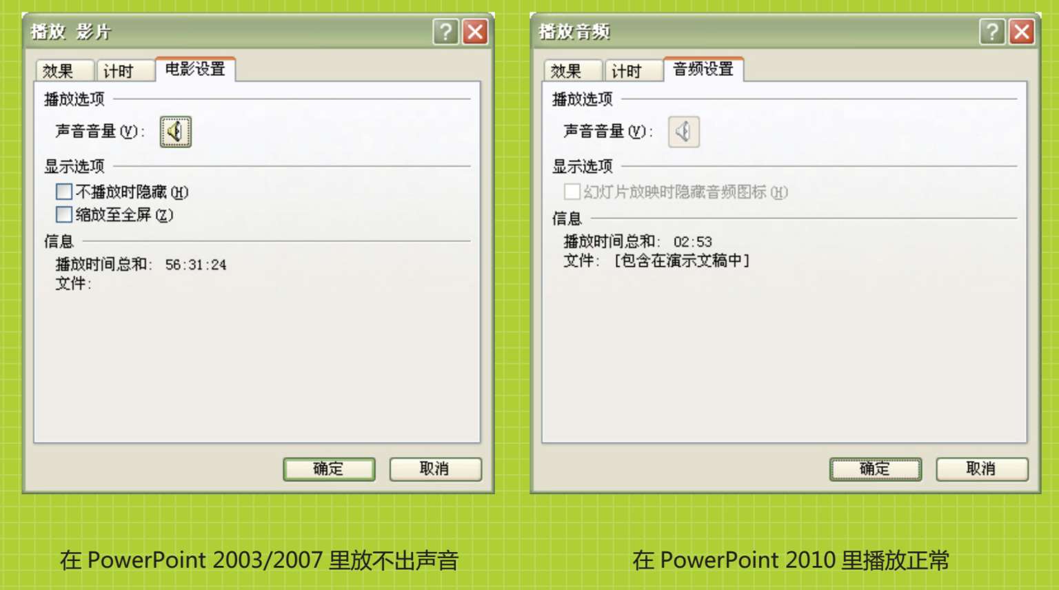 PowerPoint 2010已经顺利解决这一问题,只要是通过直接插入音频方式插入的声音,都自动嵌入到PPT里。是这样吗?是的。但不要高兴得太早了,因为有一个条件:只有用PowerPoint 2010打开时才能顺利读出,用PowerPoint 2007和2003是无法识别的。