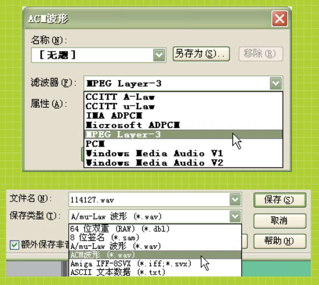 要实现声音的完美嵌入(即使在PowerPoint 2003和2007里也能正常读取),需要把wma、mp3等音乐格式转化为wav,只有后者才能实现在PowerPoint 2003和2007的完全嵌入。转换工具,推荐AdobeAudition 3.0版,打开后按以下方式另存为wav格式文件即可,所转换的wav清晰度不变,文件比mp3或wma还小。