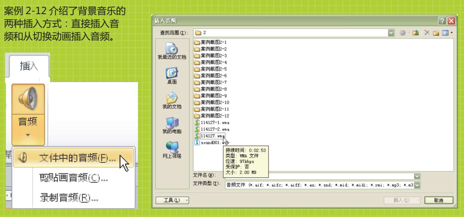 案例2-12介绍了背景音乐的两种插入方式:直接插入音频和从切换动画插入音频。