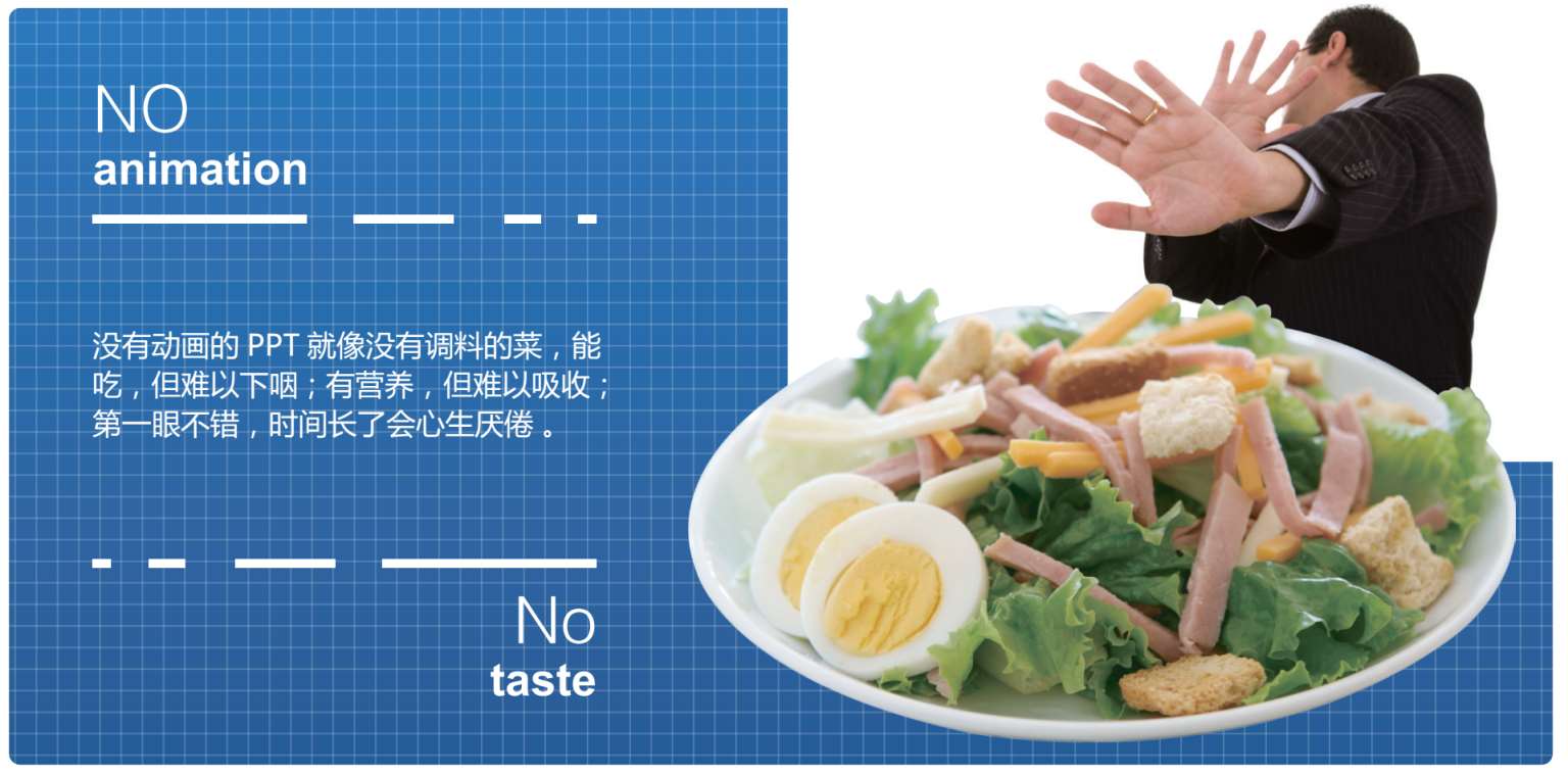 我们需要为PPT添些油、加些醋,让画面时刻运动着。精彩,但处于辅助地位;生动,但不会干扰主题;简洁,但并非可有可无;自然,但不是缺乏创意。与背景相容、与主题相符、与思路相合(参见同步案例1-5)。