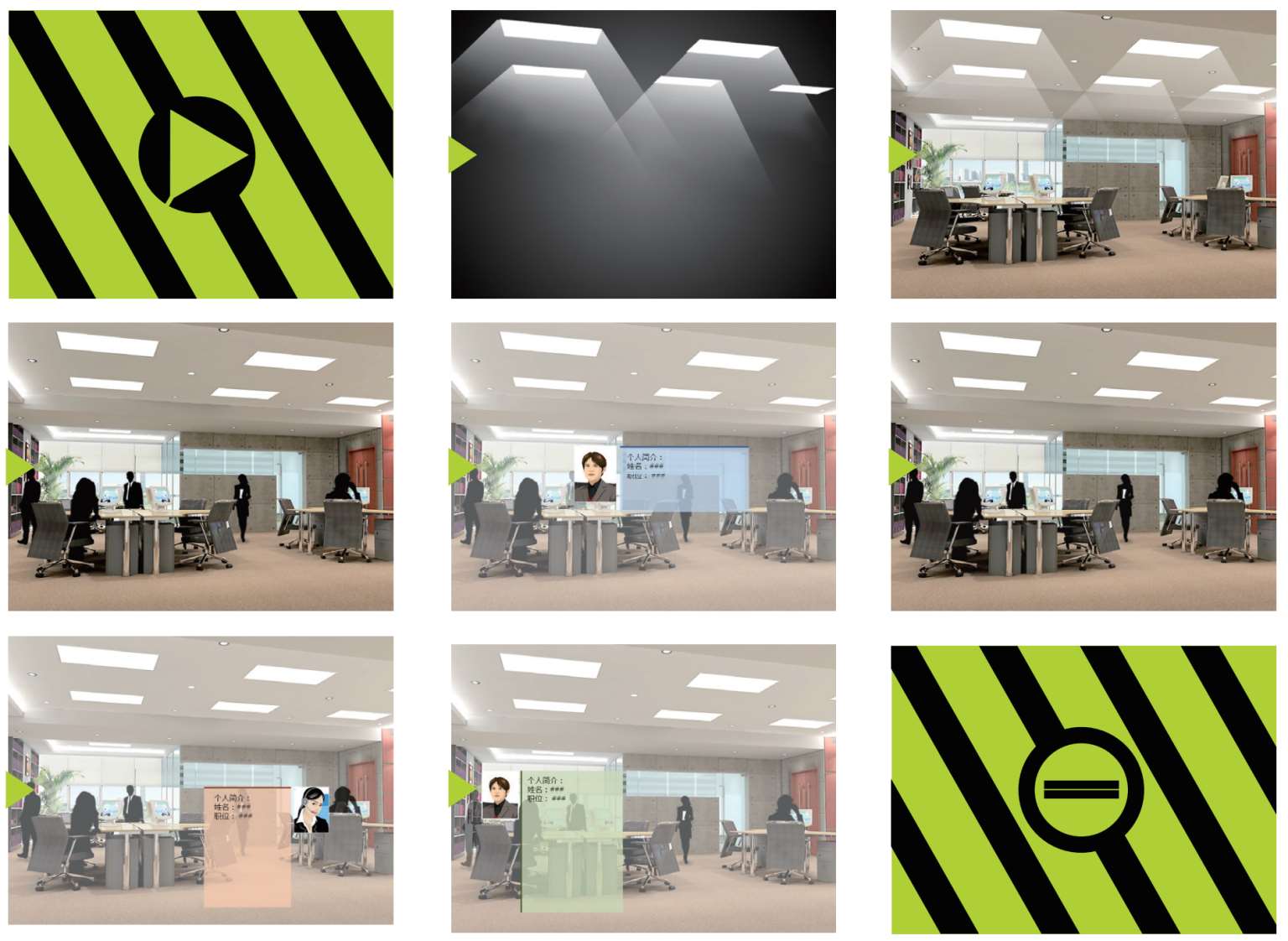 这是某子公司向集团公司进行年终工作汇报的PPT。由于该公司新成立不久,所以演示人首先介绍了本公司的成员名称和职责分工。开始,画面全黑,演示者点击鼠标,荧光灯开启,展现该公司背景;随后,所有办公人员神奇出现,并各就各位;然后画面模糊,人影依次闪烁并出现该人员的真实头像(为保护隐私,此处头像被替换)和详细介绍。