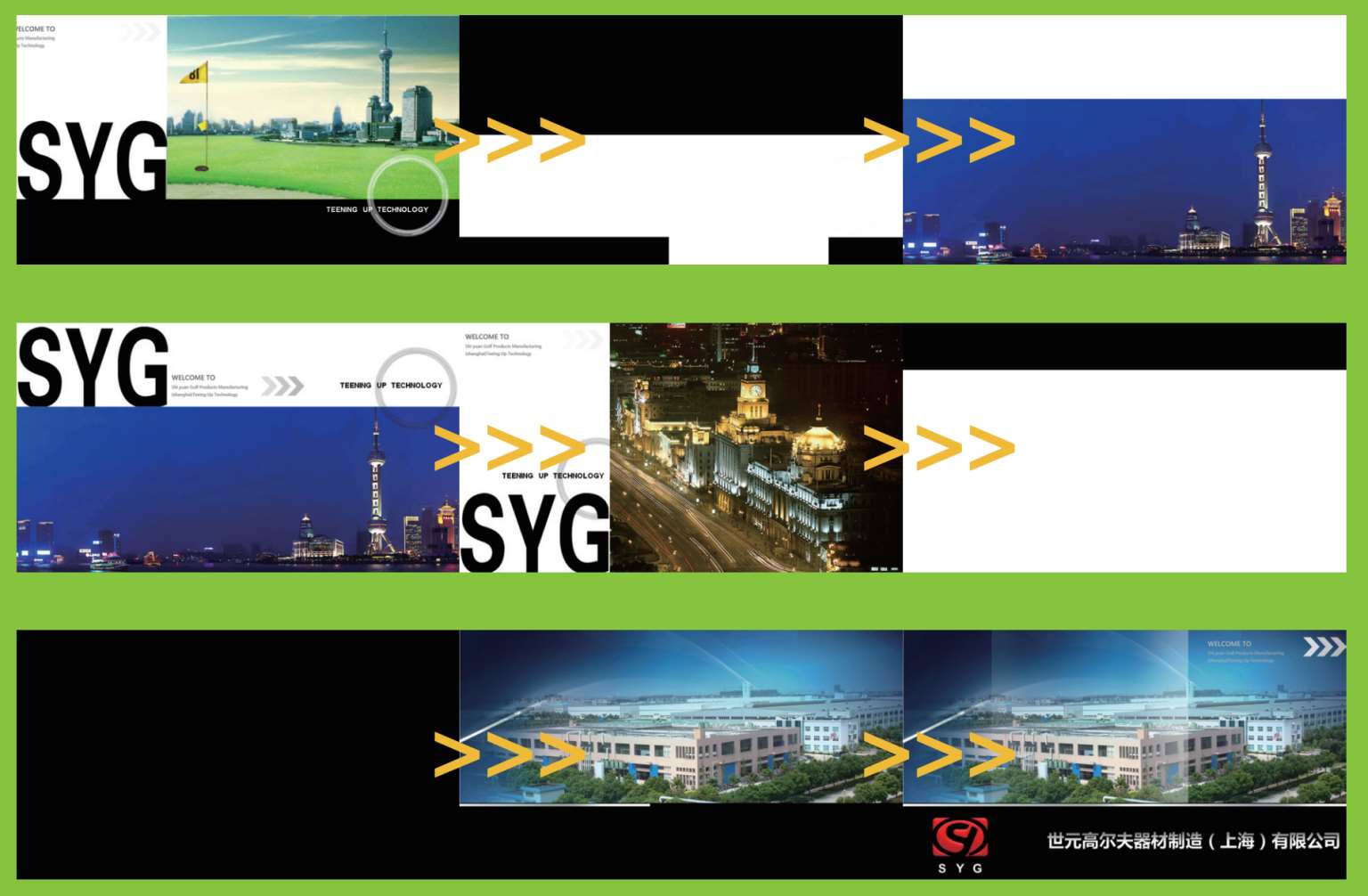 这是一套类似电子画册的某公司宣传PPT的动画片段。其表现的主旨是公司所在城市和公司外景图,所以,此处以图片为主。为了避免图片的单调,锐普设计师采用了三个明显的修饰性动画——闪烁的箭头、旋转的圆形和走动的光影。这三种元素的共同特点是:半透明效果,不过分抢眼;抽象的样式,体现商务风格;重复的动画,持续增加画面活力。