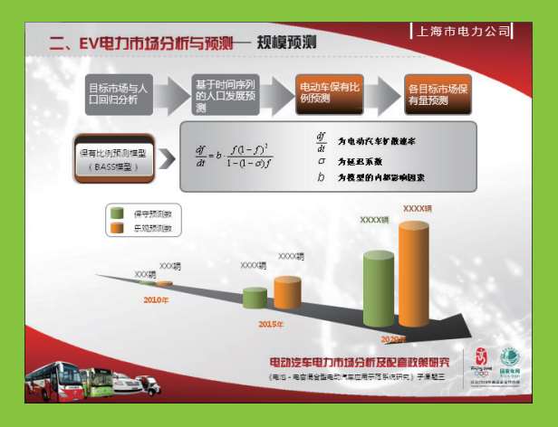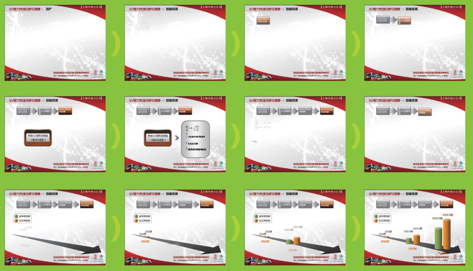 本PPT片段对EV电力市场的规模进行了预测,总共通过四个步骤来实现。在PPT的上方是导航条,依次出现四个步骤的标题并用颜色突出,下方是对四个步骤的详细解释(第1、2步骤未做展开)。在任一时刻,只有一个内容是吸引观众注意的,其余的都是灰色,观众只需要根据画面显示的线索理解就行,一目了然。
