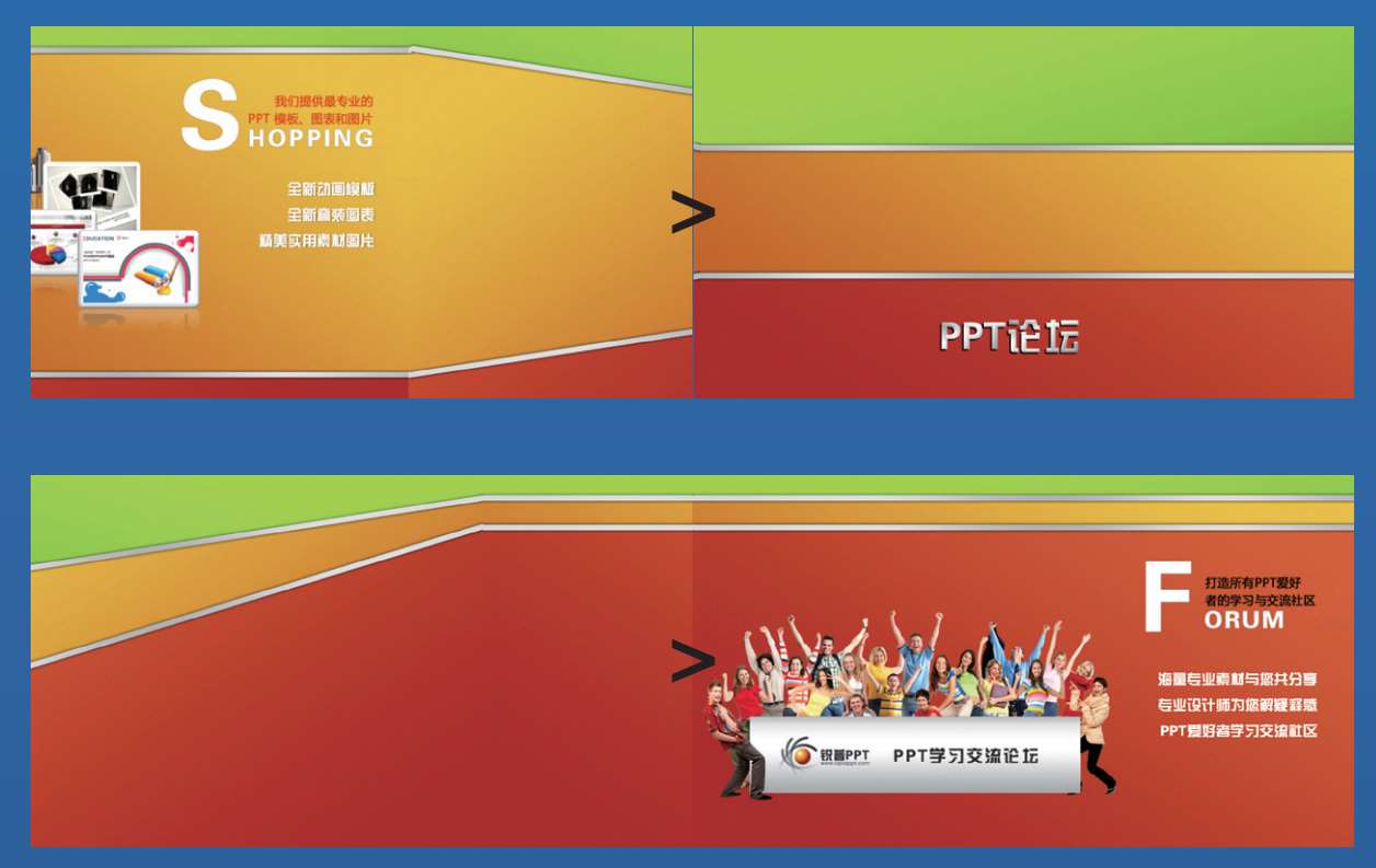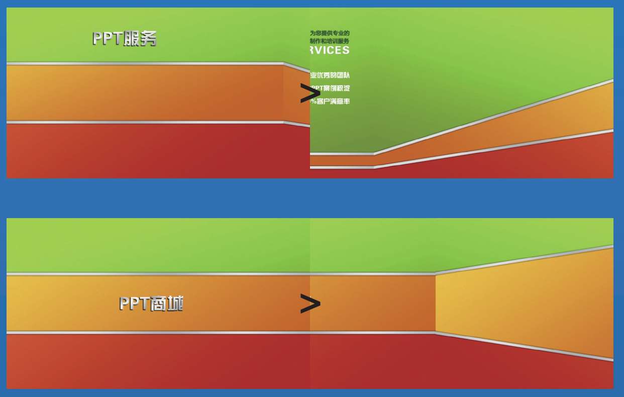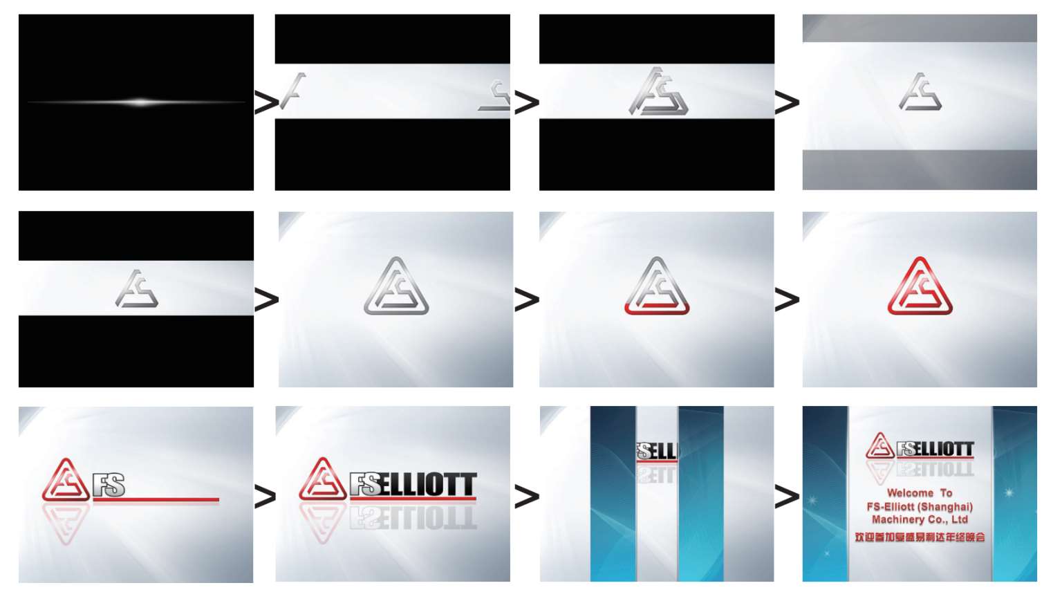 这是某公司年终晚会PPT的开场。在黑色的背景下,一束光闪过,把屏幕拉开一条宽宽的矩形,“F”、“S”两个字母拼合在一起,框上一个三角形,构成该公司的Logo轮廓。画面展开,灌满红色,引出英文标题,蓝色边框闪现,引出标题。配以富有动感的片头曲,画面大气磅礴、铿锵有力。所有观众都会目不转睛。
