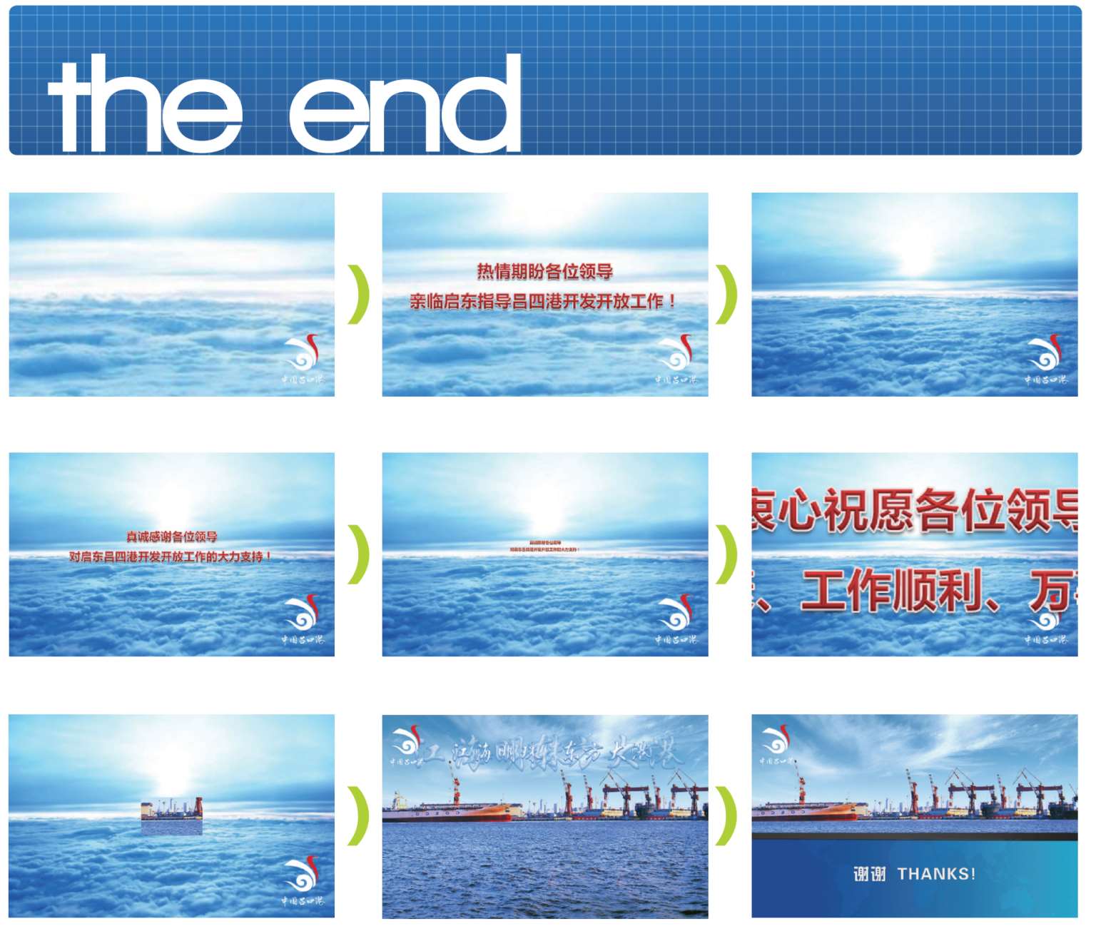这是某市政府对外形象推介会PPT的结尾。第一幅画面处于云层之颠、视野开阔,画面由近及远、气势恢宏;随后用醒目的文字标明“期盼”、“感谢”、“祝愿”等口号,让人倍感亲切、充满希望;最后画面由长空过渡到大海、港口,炫美的文字动画强调“江海明珠 东方大港”,画面与开场相呼应,打上“谢谢”字样。这样动感的终场效果,让与会者连连称赞、印象深刻。