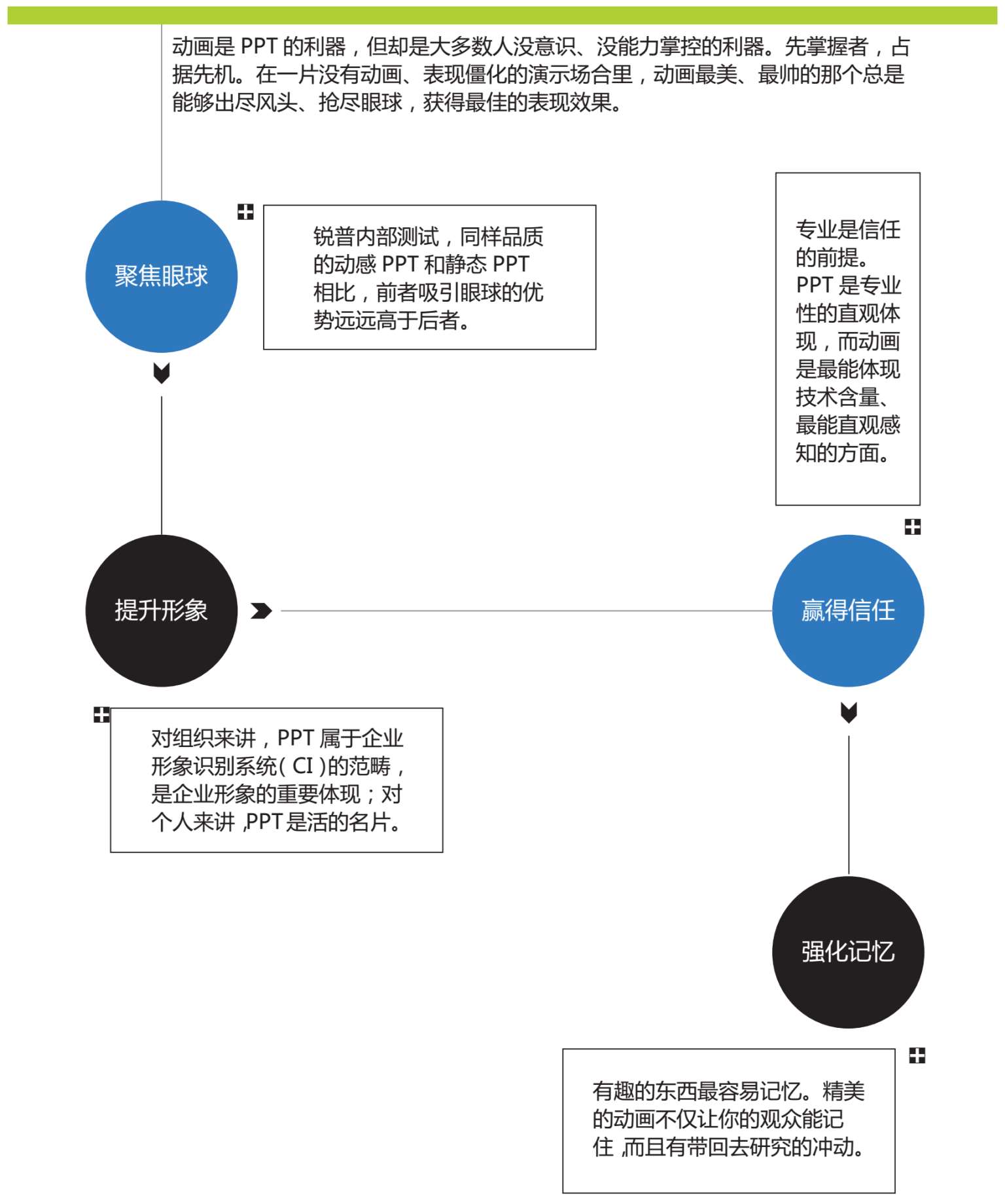 文字、图片、图表、多媒体、模板,是相互独立的PPT元素。没有动画,这些元素是分散的,像一团乱麻;动画,能够让这些元素协调配合,共同强化主题——动画先后决定了逻辑;动画显隐决定了分量;动画松紧决定了关联;动画方向决定了注意力。
