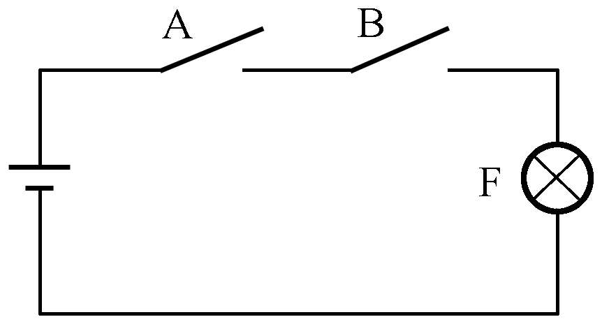 用两个开关控制一个灯。开关A,B各有两种状态,而灯F也有两种状态。如果要灯亮,则两个关A,B必须全部合上,也就是说导致灯F亮的结果只有当A,B开关都具备合上的条件时才会发生。这种因果关系在逻辑代数中被称为“与”运算。
