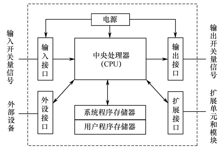 PLC硬件主要由电源、中央处理单元(CPU)、存储器、输入接口、输出接口、外设接口和扩展接口组成,其结构框图如图 1.2-4 所示。